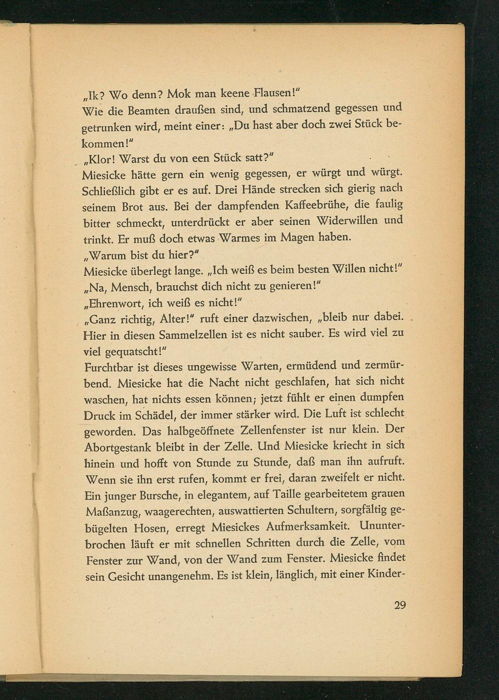 Furchtbar ist dieses ungewisse Warten, ermüdend und zermürbend. Miesicke hat die Nacht nicht geschlafen, hat sich nicht waschen, hat nichts essen können; jetzt fühlt er einen dumpfen Druck im Schädel, der immer stärker wird. Die Luft ist schlecht geworden. Das halbgeöffnete Zellenfenster ist nur klein. Der Abortgestank bleibt in der Zelle. Und Miesicke kriecht in sich hinein und hofft von Stunde zu Stunde, daß man ihn aufruft. Wenn sie ihn erst rufen, kommt er frei, daran zweifelt er nicht. Ein junger Bursche, in elegantem, auf Taille gearbeitetem grauen Maßanzug, waagerechten, auswattierten Schultern, sorgfältig gebügelten Hosen, erregt Miesickes Aufmerksamkeit. Ununterbrochen läuft er mit schnellen Schritten durch die Zelle, vom Fenster zur Wand, von der Wand zum Fenster. Miesicke findet sein Gesicht unangenehm. Es ist klein, länglich, mit einer Kinder