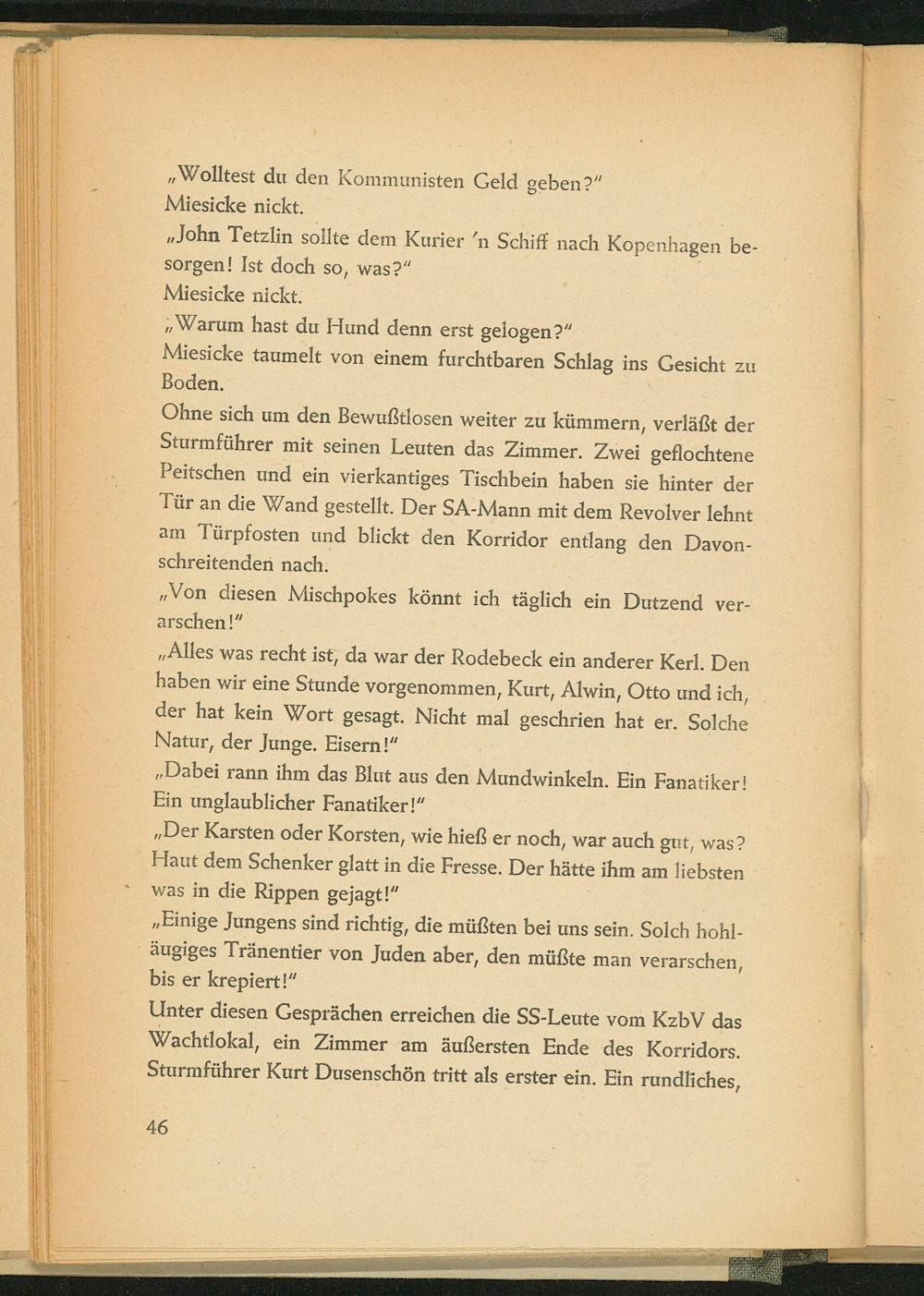 Ohne sich um den Bewußtlosen weiter zu kümmern, verläßt der Sturmführer mit seinen Leuten das Zimmer. Zwei geflochtene Peitschen und ein vierkantiges Tischbein haben sie hinter der Tür an die Wand gestellt. Der SA- Mann mit dem Revolver lehnt am Türpfosten und blickt den Korridor entlang den Davonschreitenden nach.