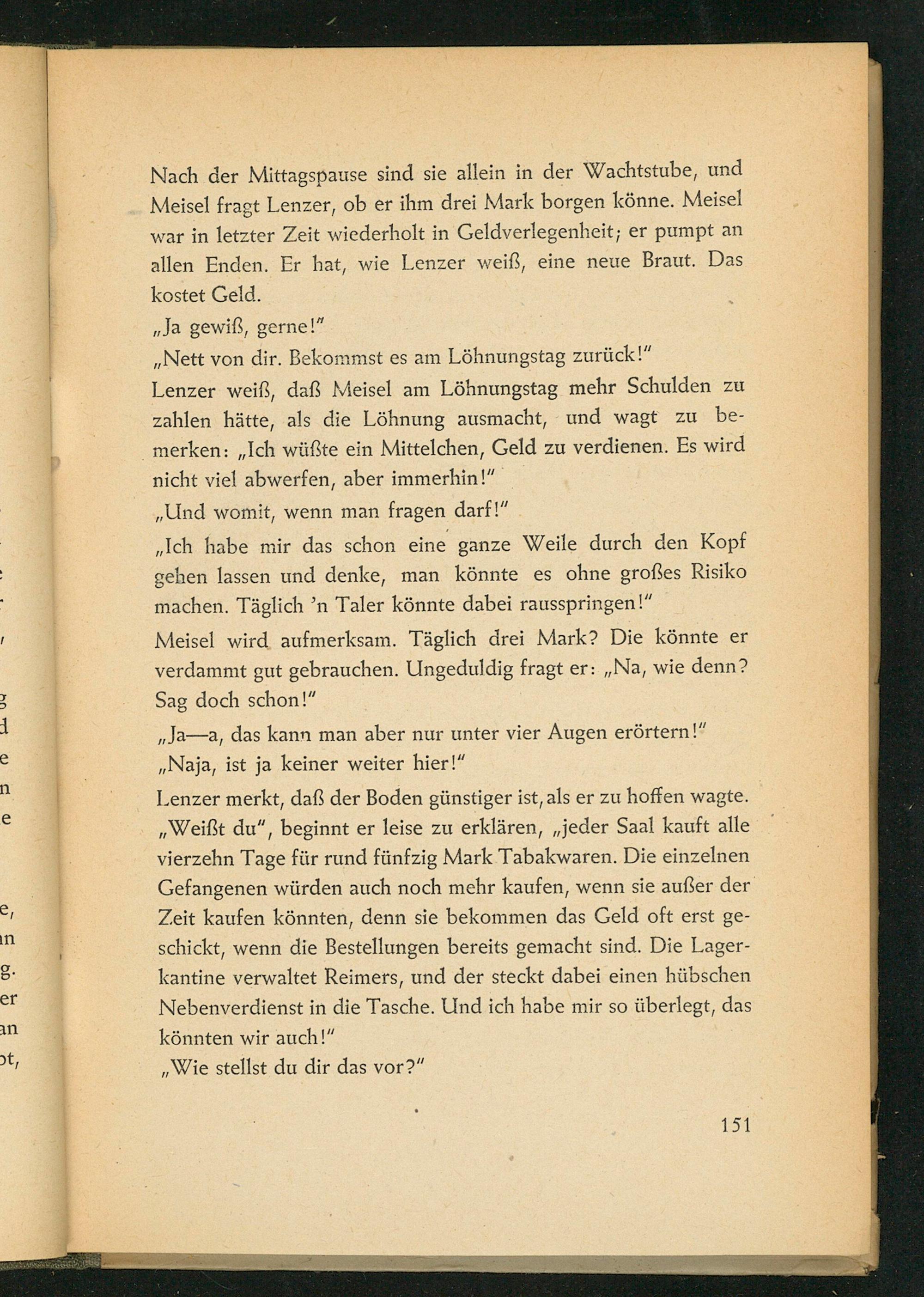 Nach der Mittagspause sind sie allein in der Wachtstube, und Meisel fragt Lenzer, ob er ihm drei Mark borgen könne. Meisel war in letzter Zeit wiederholt in Geldverlegenheit; er pumpt an allen Enden. Er hat, wie Lenzer weiß, eine neue Braut. Das kostet Geld.