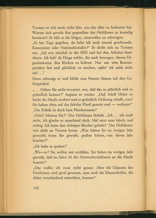 Haben Sie nicht erwartet, was, daß das so plötzlich und so gründlich kommt?" beginnt er wieder. Daß Adolf Hitler so leicht die Macht erobert und so gründlich Ordnung schafft, was? Sie haben eben auf das falsche Pferd gesetzt und- verloren!" ,, Die Politik ist doch kein Pferderennen!"