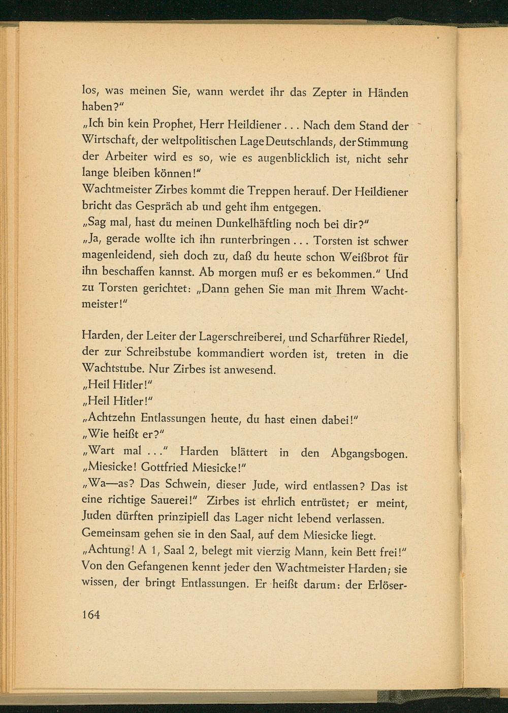 „Wa—as? Das Schwein, dieser Jude, wird entlassen? Das ist eine richtige Sauerei!” Zirbes ist ehrlich entrüstet; er meint, Juden dürften prinzipiell das Lager nicht lebend verlassen. Gemeinsam gehen sie in den Saal, auf dem Miesicke liegt. „Achtung! A 1, Saal 2, belegt mit vierzig Mann, kein Bett frei!” Von den Gefangenen kennt jeder den Wachtmeister Harden; sie wissen, der bringt Entlassungen. Er heißt darum: der Erlöser-