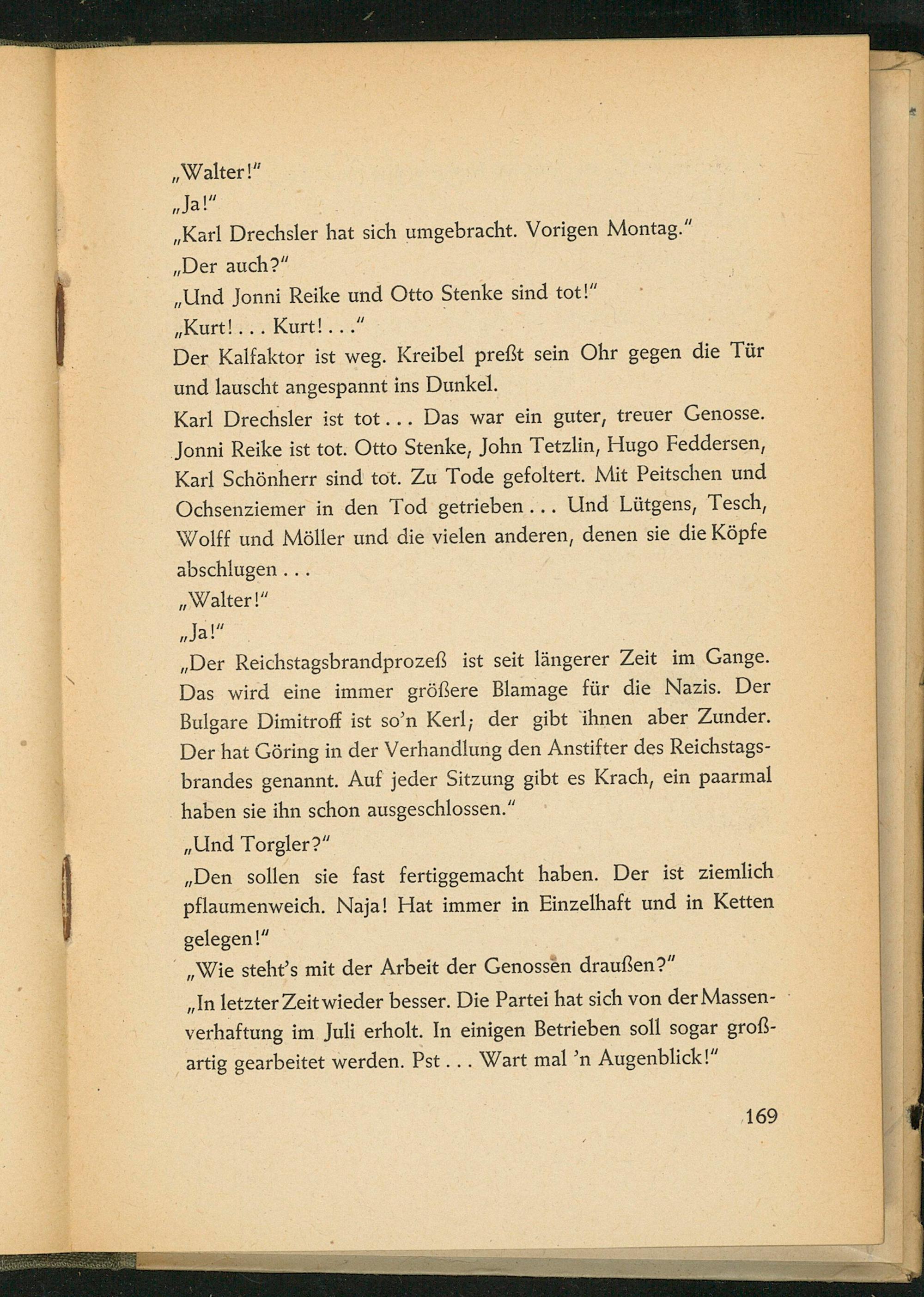 Karl Drechsler ist tot... Das war ein guter, treuer Genosse. Jonni Reike ist tot. Otto Stenke, John Tetzlin, Hugo Feddersen, Karl Schönherr sind tot. Zu Tode gefoltert. Mit Peitschen und Ochsenziemer in den Tod getrieben... Und Lütgens, Tesch, Wolff und Möller und die vielen anderen, denen sie die Köpfe abschlugen...