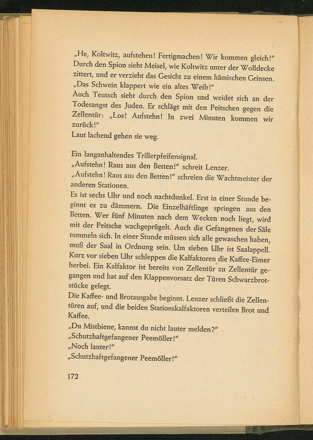 ,, He, Koltwitz, aufstehen! Fertigmachen! Wir kommen gleich!" Durch den Spion sieht Meisel, wie Koltwitz unter der Wolldecke zittert, und er verzieht das Gesicht zu einem hämischen Grinsen. ,, Das Schwein klappert wie ein altes Weib!"