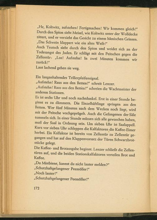 Auch Teutsch sieht durch den Spion und weidet sich an der Todesangst des Juden. Er schlägt mit den Peitschen gegen die Zellentür: Los! Aufstehn! In zwei Minuten kommen wir zurück!"