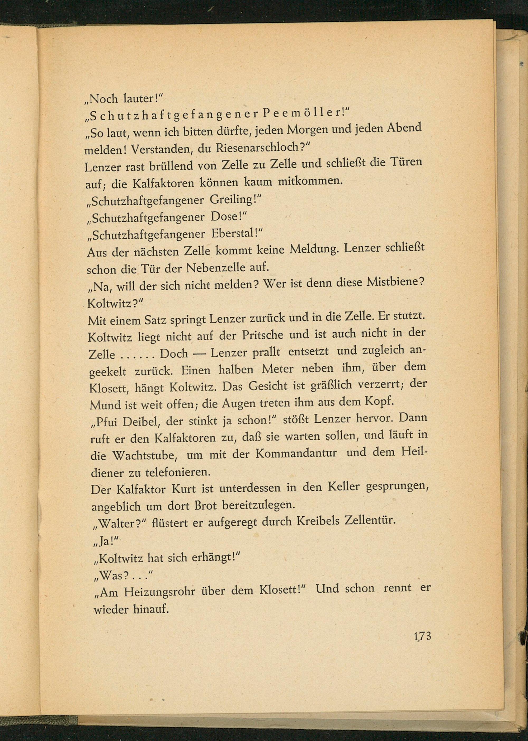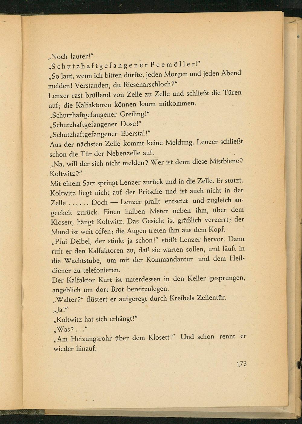 Mit einem Satz springt Lenzer zurück und in die Zelle. Er stutzt. Koltwitz liegt nicht auf der Pritsche und ist auch nicht in der Zelle...... Doch · Lenzer prallt entsetzt und zugleich angeekelt zurück. Einen halben Meter neben ihm, über dem Klosett, hängt Koltwitz. Das Gesicht ist gräßlich verzerrt; der Mund ist weit offen; die Augen treten ihm aus dem Kopf. ,, Pfui Deibel, der stinkt ja schon!" stößt Lenzer hervor. Dann ruft er den Kalfaktoren zu, daß sie warten sollen, und läuft in die Wachtstube, um mit der Kommandantur und dem Heildiener zu telefonieren.