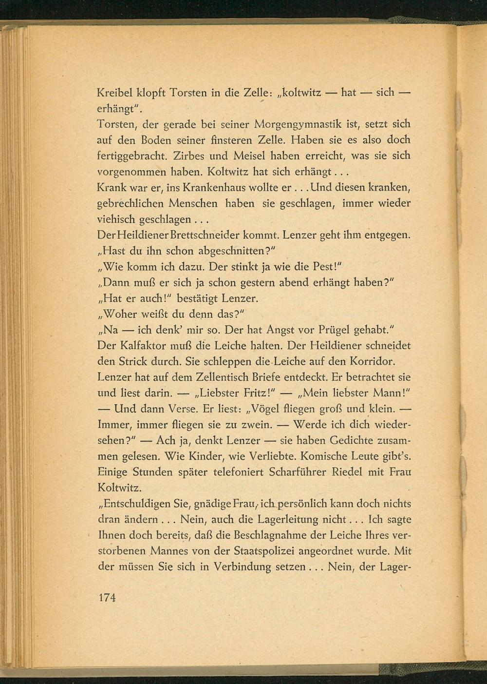 ,, Na- ich denk' mir so. Der hat Angst vor Prügel gehabt." Der Kalfaktor muß die Leiche halten. Der Heildiener schneidet den Strick durch. Sie schleppen die Leiche auf den Korridor. Lenzer hat auf dem Zellentisch Briefe entdeckt. Er betrachtet sie und liest darin. ,, Liebster Fritz!" ,, Mein liebster Mann!"