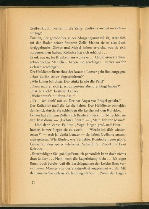 Und dann Verse. Er liest: ,, Vögel fliegen groß und klein. Immer, immer fliegen sie zu zwein. Werde ich dich wiedersehen?".- Ach ja, denkt Lenzer sie haben Gedichte zusammen gelesen. Wie Kinder, wie Verliebte. Komische Leute gibt's. Einige Stunden später telefoniert Scharführer Riedel mit Frau Koltwitz.