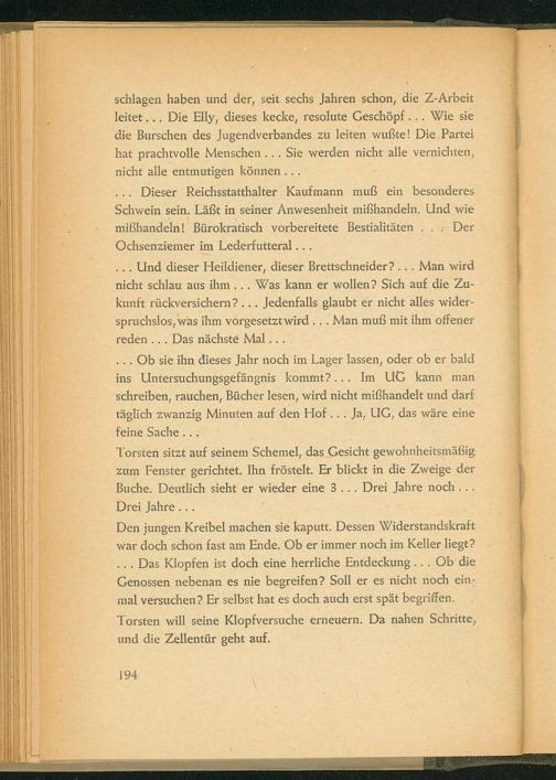 Den jungen Kreibel machen sie kaputt. Dessen Widerstandskraft war doch schon fast am Ende. Ob er immer noch im Keller liegt? ... Das Klopfen ist doch eine herrliche Entdeckung... Ob die Genossen nebenan es nie begreifen? Soll er es nicht noch einmal versuchen? Er selbst hat es doch auch erst spät begriffen. Torsten will seine Klopfversuche erneuern. Da nahen Schritte, und die Zellentür geht auf.
