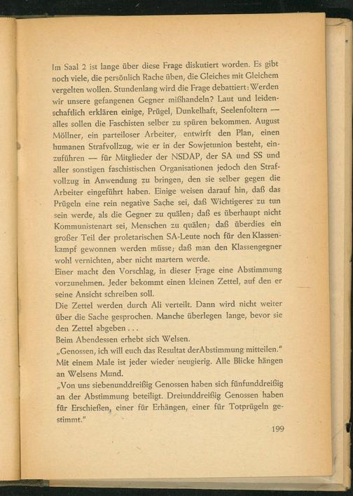 „Von uns siebenunddreißig Genossen haben sich fünfunddreißig an der Abstimmung beteiligt. Dreiunddreißig Genossen haben für Erschießen, einer für Erhängen, einer für Totprügeln ge- stimmt.” S