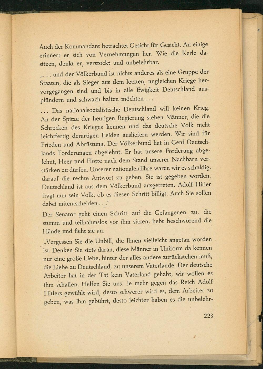 -.. Das nationalsozialistische Deutschland will keinen Krieg. An der Spitze der heutigen Regierung stehen Männer, die die Schrecken des Krieges kennen und das deutsche Volk nicht leichtfertig derartigen Leiden ausliefern werden. Wir sind für Frieden und Abrüstung. Der Völkerbund hat in Genf Deutsch - lands Forderungen abgelehnt. Er hat unsere Forderung abge- lehnt, Heer und Flotte nach dem Stand unserer Nachbarn ver- stärken zu dürfen. Unserer nationalen Ehre waren wir es schuldig, darauf die rechte Antwort zu geben. Sie ist gegeben worden. Deutschland ist aus dem Völkerbund ausgetreten. Adolf Hitler fragt nun sein Volk, ob es diesen Schritt billigt. Auch Sie sollen dabei mitentscheiden..."