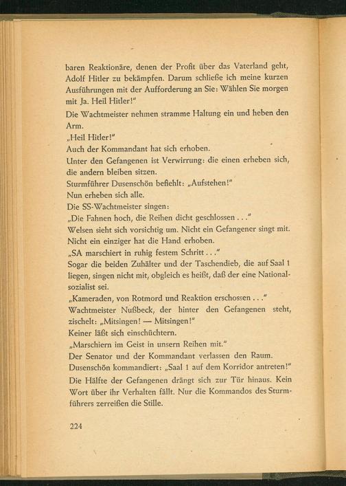 Der Senator und der Kommandant verlassen den Raum. Dusenschön kommandiert: ,, Saal 1 auf dem Korridor antreten!" Die Hälfte der Gefangenen drängt sich zur Tür hinaus. Kein Wort über ihr Verhalten fällt. Nur die Kommandos des Sturmführers zerreißen die Stille.