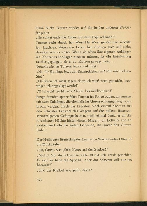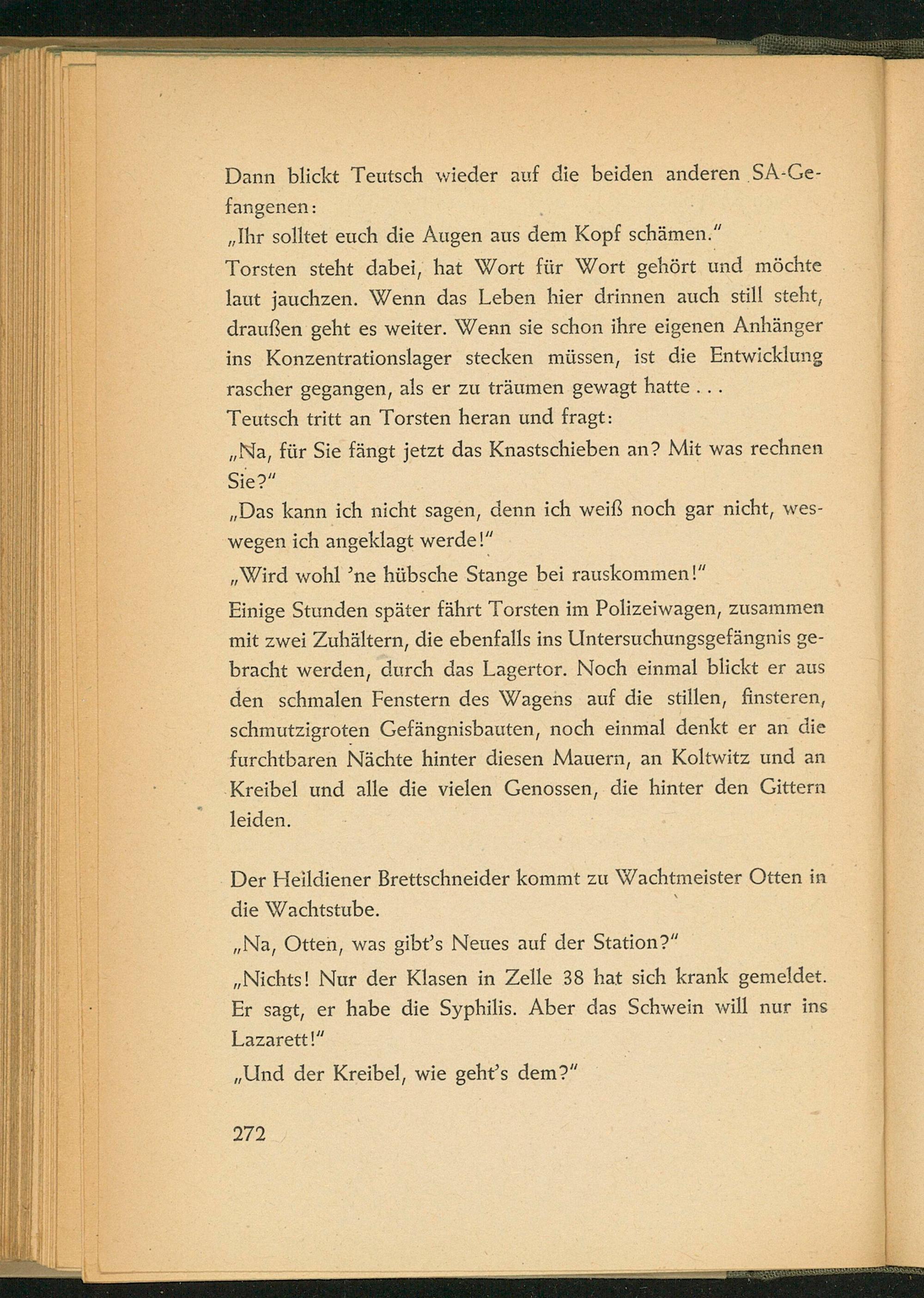 Einige Stunden später fährt Torsten im Polizeiwagen, zusammen mit zwei Zuhältern, die ebenfalls ins Untersuchungsgefängnis gebracht werden, durch das Lagertor. Noch einmal blickt er aus den schmalen Fenstern des Wagens auf die stillen, finsteren, schmutzigroten Gefängnisbauten, noch einmal denkt er an die furchtbaren Nächte hinter diesen Mauern, an Koltwitz und an Kreibel und alle die vielen Genossen, die hinter den Gittern leiden.