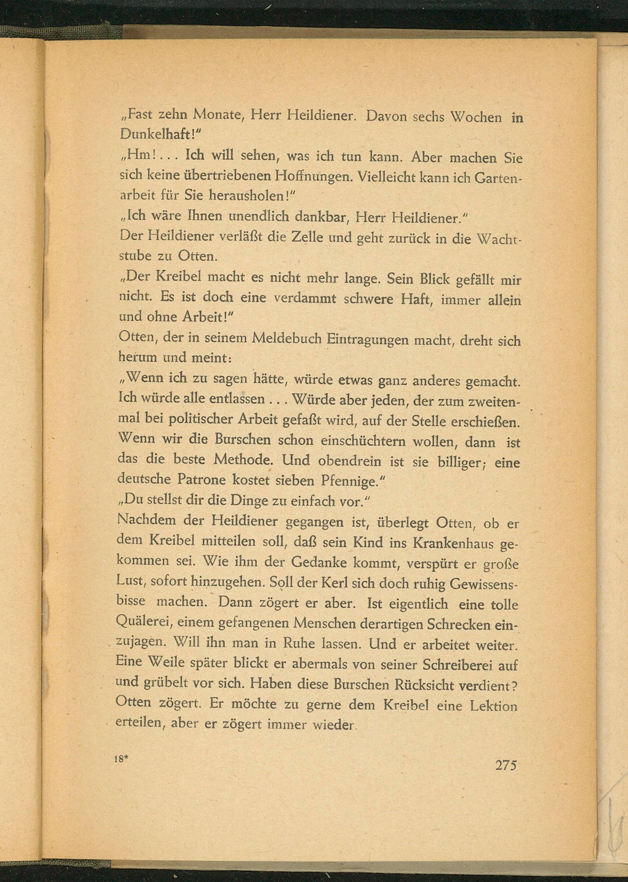 Nachdem der Heildiener gegangen ist, überlegt Otten, ob er dem Kreibel mitteilen soll, daß sein Kind ins Krankenhaus ge- kommen sei. Wie ihm der Gedanke kommt, verspürt er große Lust, sofort hinzugehen. Soll der Kerl sich doch ruhig Gewissens- bisse machen. Dann zögert er aber. Ist eigentlich eine tolle Quälerei, einem gefangenen Menschen derartigen Schrecken ein- zujagen. Will ihn man in Ruhe lassen. Und er arbeitet weiter. Eine Weile später blickt er abermals von seiner Schreiberei auf und grübelt vor sich. Haben diese Burschen Rücksicht verdient? Otten zögert. Er möchte zu gerne dem Kreibel eine Lektion . erteilen, aber er zögert immer wieder.