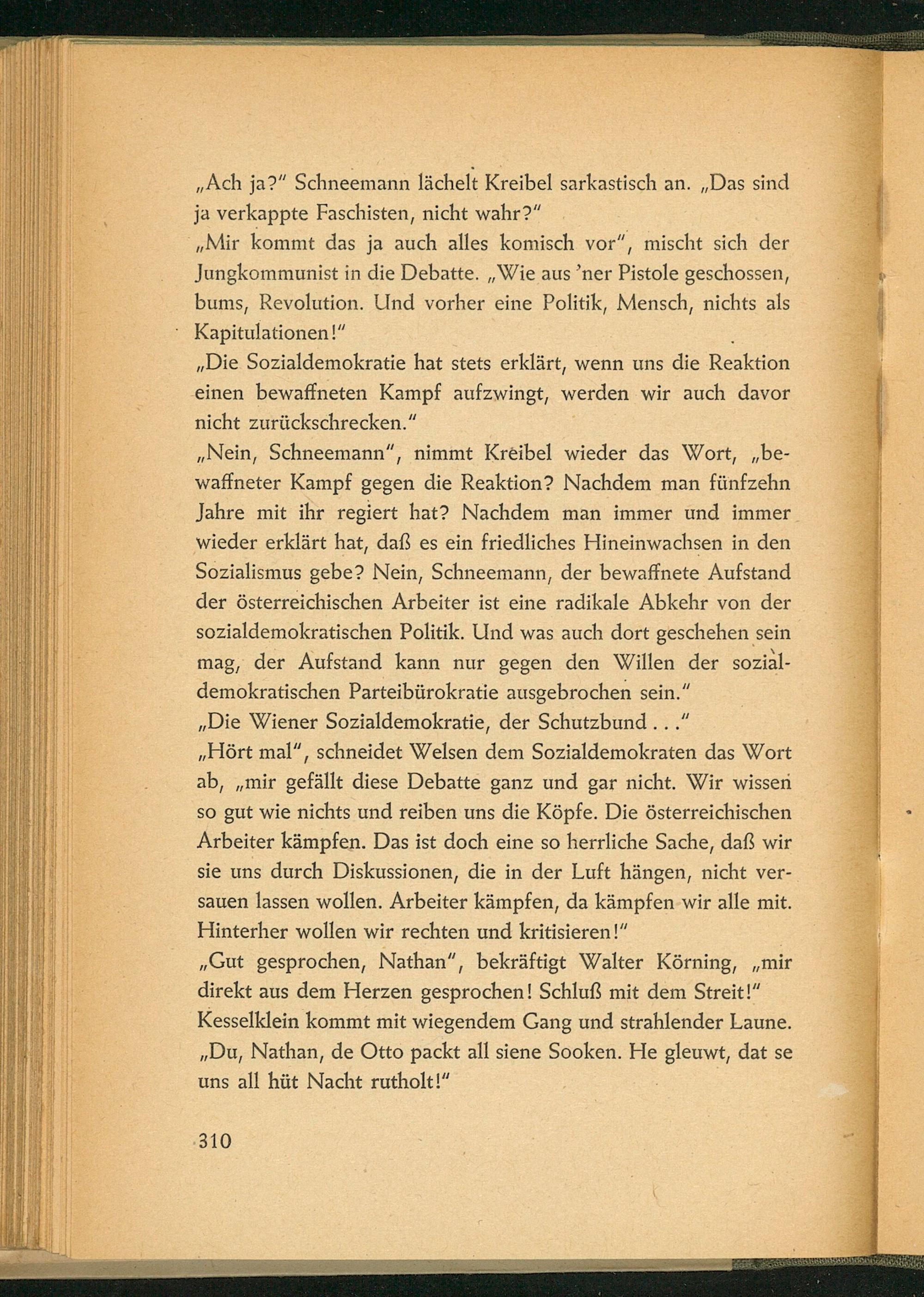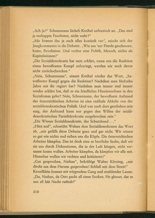 „Nein, Schneemann”, nimmt Kreibel wieder das Wort,„be- waffneter Kampf gegen die Reaktion? Nachdem man fünfzehn Jahre mit ihr regiert hat? Nachdem man immer und immer wieder erklärt hat, daß es ein friedliches Hineinwachsen in den Sozialismus gebe? Nein, Schneemann, der bewaffnete Aufstand der österreichischen Arbeiter ist eine radikale Abkehr von der sozialdemokratischen Politik. Und was auch dort geschehen sein mag, der Aufstand kann nur gegen den Willen der sozial- demokratischen Parteibürokratie ausgebrochen sein.”