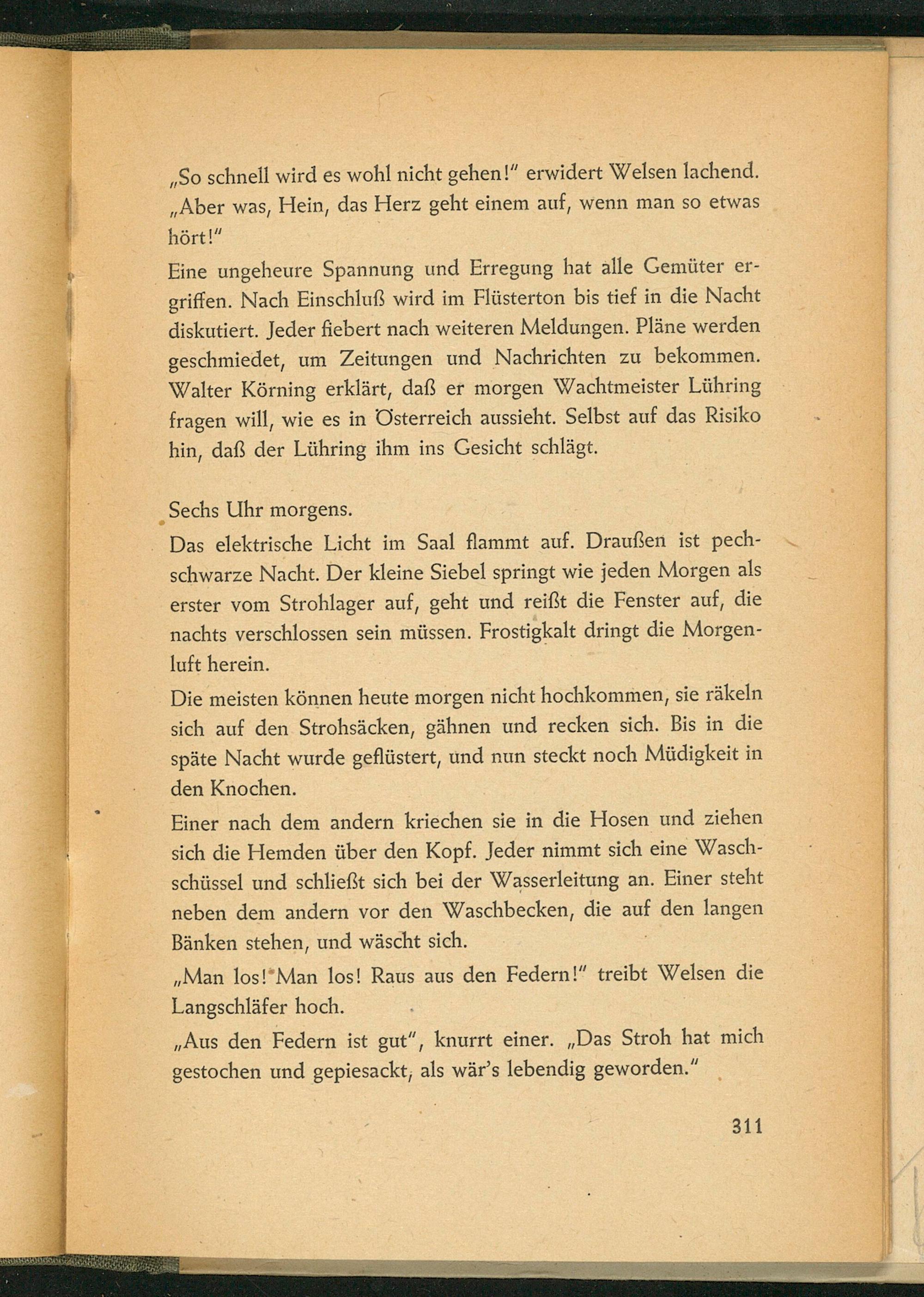Eine ungeheure Spannung und Erregung hat alle Gemüter er- griffen. Nach Einschluß wird im Flüsterton bis tief in die Nacht diskutiert. Jeder fiebert nach weiteren Meldungen. Pläne werden geschmiedet, um Zeitungen und Nachrichten zu bekommen. Walter Körning erklärt, daß er morgen Wachtmeister Lühring fragen will, wie es in Osterreich aussieht. Selbst auf das Risiko hin, daß der Lühring ihm ins Gesicht schlägt.
