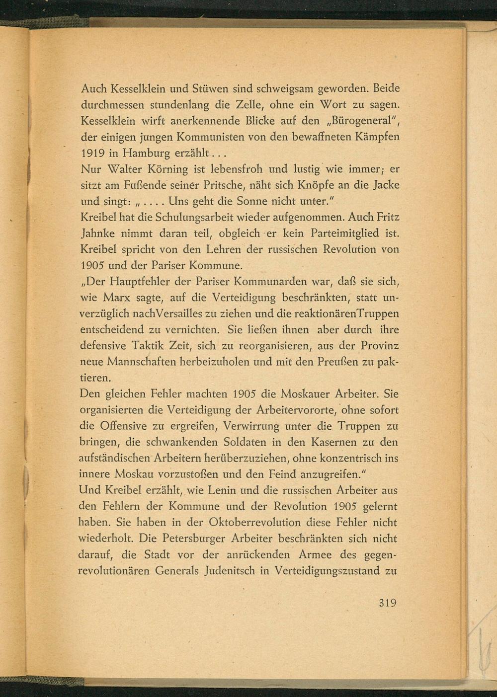 Auch Kesselklein und Stüwen sind schweigsam geworden. Beide durchmessen stundenlang die Zelle, ohne ein Wort zu sagen. Kesselklein wirft anerkennende Blicke auf den Bürogeneral", der einigen jungen Kommunisten von den bewaffneten Kämpfen 1919 in Hamburg erzählt...