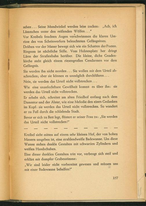 Er erhebt sich, schreitet am alten Friedhof entlang nach dem Dammtor und der Alster, wie eine Melodie den einen Gedanken im Kopf: sie werden das Urteil nicht vollstrecken. So wandert er zu Fuß durch die schlafende Stadt.