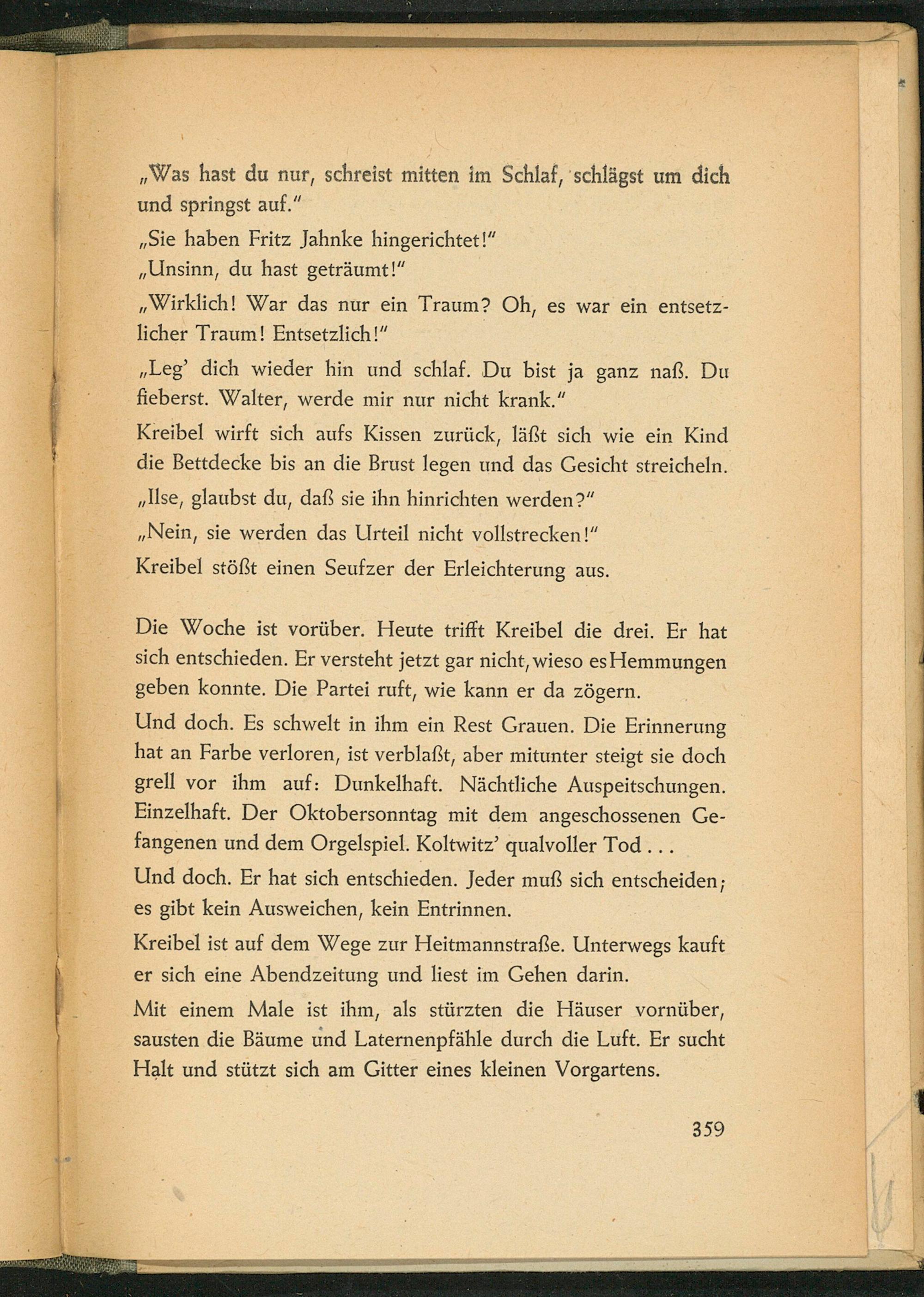 Kreibel wirft sich aufs Kissen zurück, läßt sich wie ein Kind die Bettdecke bis an die Brust legen und das Gesicht streicheln. ,, Ilse, glaubst du, daß sie ihn hinrichten werden?" ,, Nein, sie werden das Urteil nicht vollstrecken!" Kreibel stößt einen Seufzer der Erleichterung aus.