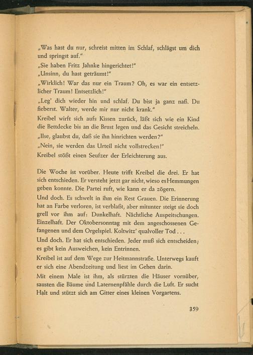Und doch. Es schwelt in ihm ein Rest Grauen. Die Erinnerung hat an Farbe verloren, ist verblaßt, aber mitunter steigt sie doch grell vor ihm auf: Dunkelhaft. Nächtliche Auspeitschungen. Einzelhaft. Der Oktobersonntag mit dem angeschossenen Gefangenen und dem Orgelspiel. Koltwitz' qualvoller Tod... Und doch. Er hat sich entschieden. Jeder muß sich entscheiden; es gibt kein Ausweichen, kein Entrinnen.