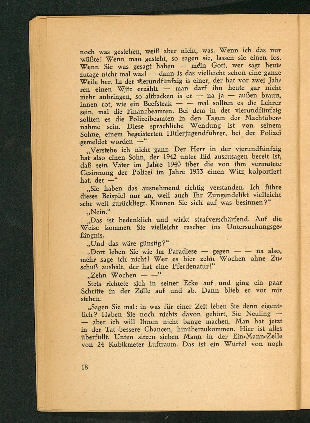 noch was gestehen, weiß aber nicht, was. Wenn ich das nur wüßte! Wenn man gesteht, so sagen sie, lassen sie einen los. Wenn Sie was gesagt haben mein Gott, wer sagt heut zutage nicht mal was! dann is das vielleicht schon eine ganze Weile her. In der vierundfünfzig is einer, der hat vor zwei Jahren einen Witz erzählt man darf ihn heute gar nicht mehr anbringen, so altbacken is er außen braun, na ja innen rot, wie ein Beefsteak mal sollten es die Lehrer sein, mal die Finanzbeamten. Bei dem in der vierundfünfzig sollten es die Polizeibeamten in den Tagen der Machtübernahme sein. Diese sprachliche Wendung ist von seinem Sohne, einem begeisterten Hitlerjugendführer, bei der Polizei gemeldet worden