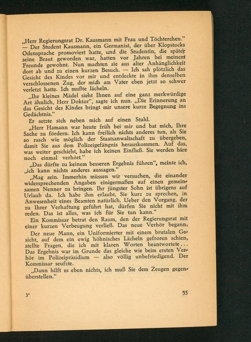 Herr Hamann war heute früh bei mir und bat mich, Ihre Sache zu fördern. Ich kann freilich nichts anderes tun, als Sie so rasch wie möglich der Staatsanwaltschaft zu übergeben, damit Sie aus dem Polizeigefängnis herauskommen. Auf das, was weiter geschieht, habe ich keinen Einfluß. Sie werden hier noch einmal verhört."