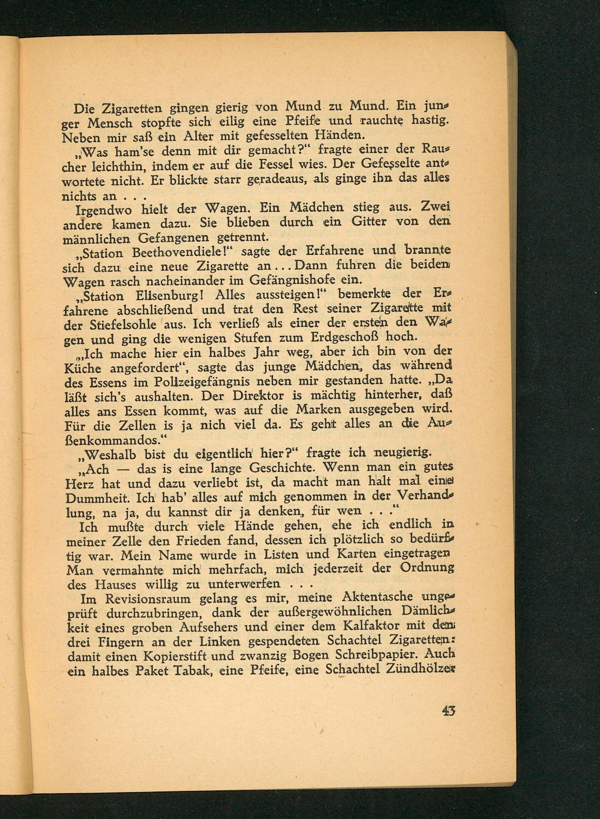 ,, Station Beethovendiele!" sagte der Erfahrene und brannte sich dazu eine neue Zigarette an... Dann fuhren die beiden Wagen rasch nacheinander im Gefängnishofe ein.