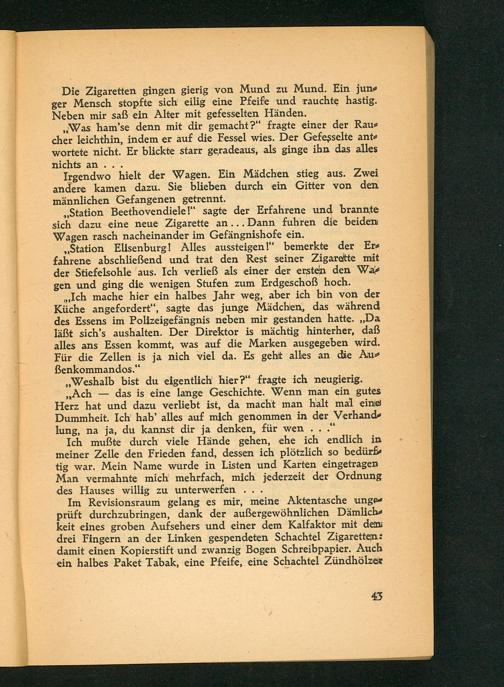 Die Zigaretten gingen gierig von Mund zu Mund. Ein junger Mensch stopfte sich eilig eine Pfeife und rauchte hastig. Neben mir saß ein Alter mit gefesselten Händen.