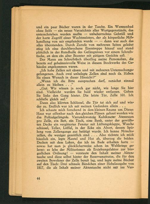 Ich schaute mich forschend in dem kleinen Raume um. Dieses Haus war offenbar nach den gleichen Plänen gebaut worden wie das Polizeigefängnis. Vierundzwanzig Kubikmeter Atemraum pro Zelle, ein Bett, ein Tisch, eine Bank, unter der gewölb ten Decke ein vergittertes Fenster mit Lüftungsklappe, Wasche schüssel, Teller, Löffel, in der Ecke ein Abort, dessen Spülung vom Zellengange aus betätigt wurde. Ich kenne Mönchszellen, die weniger gemütlich sind. Also richtete ich mich häuslich ein, legte Mantel und Hut ab, überzog die beiden Decken mit dem Laken, das ich im Bade erhalten hatte sowas hat man ja glücklicherweise schon im Weltkriege gelernt: es lebe der Militarismus als Erziehungsfaktor zur bür gerlichen Ordnung! verstaute den Inhalt meiner Aktentasche und diese selbst hinter der Reservematratze, die für den zweiten Bewohner der Zelle bereit lag, und legte meine Bücher auf den Tisch: Drei schmale Bändchen einer Hebelausgabe von 1817, die als Inhalt meiner Aktentasche nicht mit ins Ver