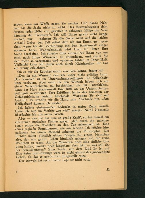 ,, Das ist ein Wunsch, den ich leider nicht erfüllen kann. Das Rauchen ist im Untersuchungsgefängnis für Zellenhäftlinge verboten. Aber wenn Sie den Wunsch haben, sich mit etwas Wesentlicherem zu beschäftigen als mit Tütenkleben, kann der Herr Staatsanwalt Ihre Bitte an das Untersuchungsgefängnis weiterleiten. Ihre Erfüllung ist in das Ermessen der Gefängnisleitung gestellt. Nochmals: Wappnen Sie sich mit Geduld!" Er streckte mir die Hand zum Abschiede hin. ,, Am Heiligabend komme ich wieder."
