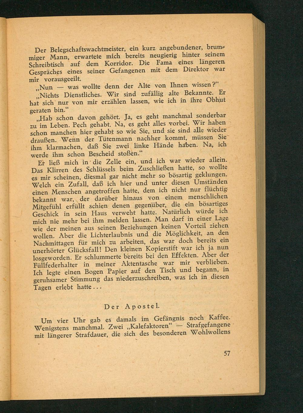 Der Belegschaftswachtmeister, ein kurz angebundener, brummiger Mann, erwartete mich bereits neugierig hinter seinem Schreibtisch auf dem Korridor. Die Fama eines längeren Gespräches eines seiner Gefangenen mit dem Direktor war mir vorausgeeilt.