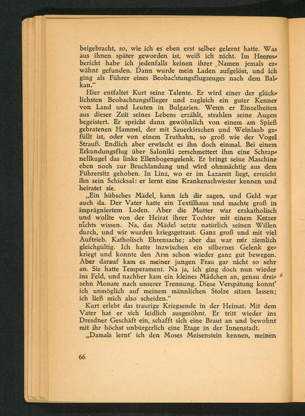 Hier entfaltet Kurt seine Talente. Er wird einer der glücklichsten Beobachtungsflieger und zugleich ein guter Kenner von Land und Leuten in Bulgarien . Wenn er Einzelheiten aus dieser Zeit seines Lebens erzählt, strahlen seine Augen begeistert. Er spricht dann gewöhnlich von einem am Spieẞ gebratenen Hammel, der mit Sauerkirschen und Weinlaub gefüllt ist, oder von einem Truthahn, so groß wie der Vogel Strauß. Endlich aber erwischt es ihn doch einmal. Bei einem Erkundungsflug über Saloniki zerschmettert ihm eine Schrapnellkugel das linke Ellenbogengelenk. Er bringt seine Maschine eben noch zur Bruchlandung und wird ohnmächtig aus dem Führersitz gehoben. In Linz , wo er im Lazarett liegt, erreicht ihn sein Schicksal: er lernt eine Krankenschwester kennen und heiratet sie.