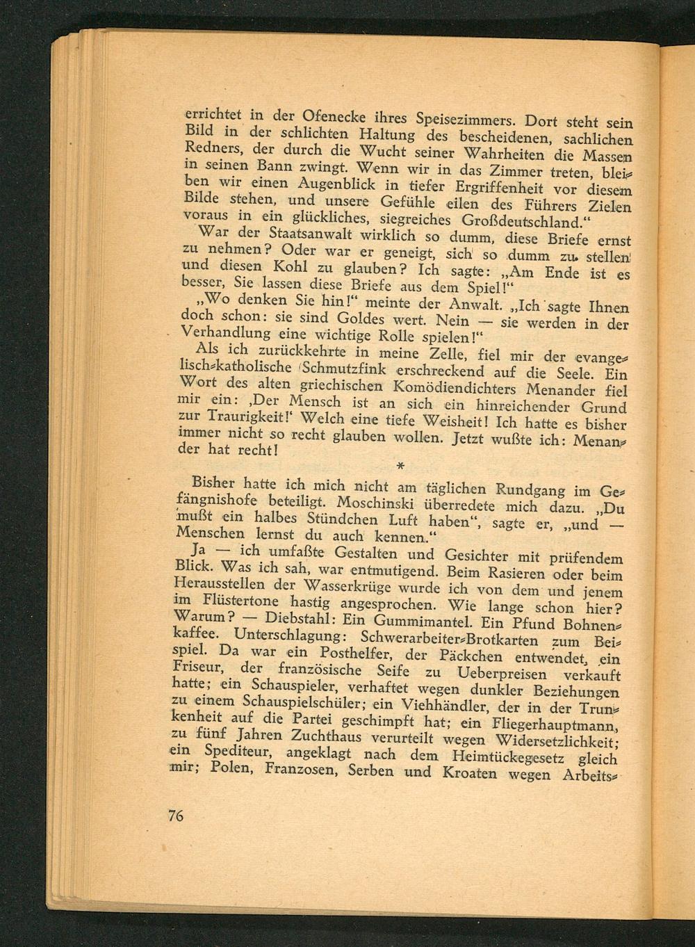 Ja ich umfaßte Gestalten und Gesichter mit prüfendem Blick. Was ich sah, war entmutigend. Beim Rasieren oder beim Herausstellen der Wasserkrüge wurde ich von dem und jenem im Flüstertone hastig angesprochen. Wie lange schon hier? Warum? Diebstahl: Ein Gummimantel. Ein Pfund Bohnenkaffee. Unterschlagung: Schwerarbeiter- Brotkarten zum Beispiel. Da war ein Posthelfer, der Päckchen entwendet, ein Friseur, der französische Seife zu Ueberpreisen verkauft hatte; ein Schauspieler, verhaftet wegen dunkler Beziehungen zu einem Schauspielschüler; ein Viehhändler, der in der Trun kenheit auf die Partei geschimpft hat; ein Fliegerhauptmann, zu fünf Jahren Zuchthaus verurteilt wegen Widersetzlichkeit; ein Spediteur, angeklagt nach dem Heimtückegesetz gleich mir; Polen, Franzosen , Serben und Kroaten wegen Arbeits