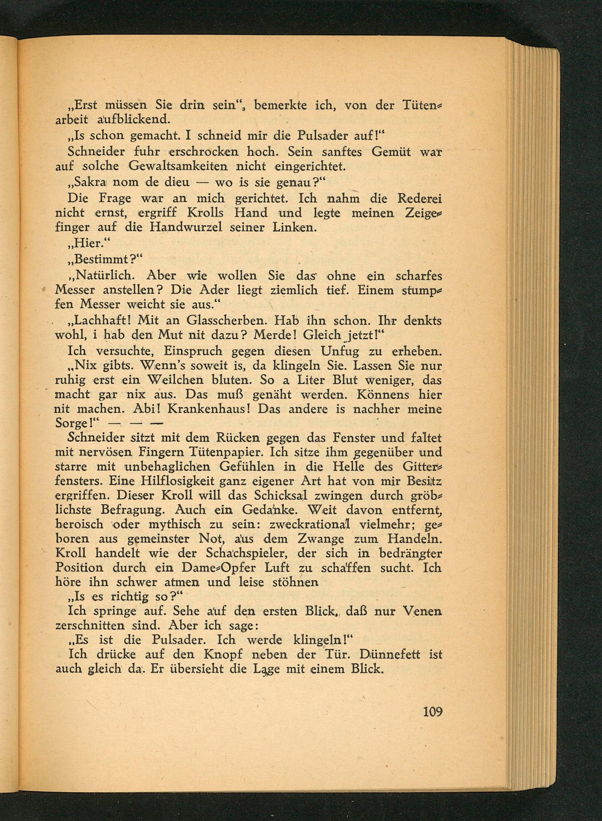 Schneider sitzt mit dem Rücken gegen das Fenster und faltet mit nervösen Fingern Tütenpapier. Ich sitze ihm gegenüber und starre mit unbehaglichen Gefühlen in die Helle des Gitterfensters. Eine Hilflosigkeit ganz eigener Art hat von mir Besitz ergriffen. Dieser Kroll will das Schicksal zwingen durch gröblichste Befragung. Auch ein Gedanke. Weit davon entfernt, heroisch oder mythisch zu sein: zweckrational vielmehr; geboren aus gemeinster Not, aus dem Zwange zum Handeln. Kroll handelt wie der Schachspieler, der sich in bedrängter Position durch ein Dame- Opfer Luft zu schaffen sucht. Ich höre ihn schwer atmen und leise stöhnen