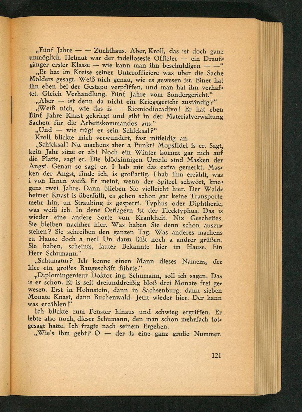 ,, Diplomingenieur Doktor ing. Schumann, soll ich sagen. Das is er schon. Er is seit dreiunddreißig bloß drei Monate frei gewesen. Erst in Hohnstein , dann in Sachsenburg, dann sieben Monate Knast, dann Buchenwald . Jetzt wieder hier. Der kann was erzählen!"