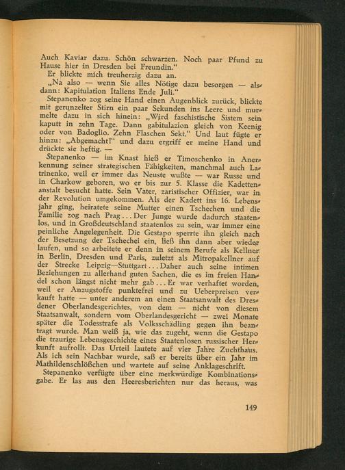 Stepanenko im Knast hieß er Timoschenko in Anerkennung seiner strategischen Fähigkeiten, manchmal auch Latrinenko, weil er immer das Neuste wußte war Russe und in Charkow geboren, wo er bis zur 5. Klasse die Kadettenanstalt besucht hatte. Sein Vater, zaristischer Offizier, war in der Revolution umgekommen. Als der Kadett ins 16. Lebensjahr ging, heiratete seine Mutter einen Tschechen und die Familie zog nach Prag ... Der Junge wurde dadurch staatenlos, und in Großdeutschland staatenlos zu sein, war immer eine peinliche Angelegenheit. Die Gestapo sperrte ihn gleich nach der Besetzung der Tschechei ein, ließ ihn dann aber wieder laufen, und so arbeitete er denn in seinem Berufe als Kellner in Berlin, Dresden und Paris , zuletzt als Mitropakellner auf der Strecke Leipzig- Stuttgart ... Daher auch seine intimen Beziehungen zu allerhand guten Sachen, die es im freien Han del schon längst nicht mehr gab... Er war verhaftet worden, weil er Anzugstoffe punktefrei und zu Ueberpreisen ver kauft hatte unter anderem an einen Staatsanwalt des Dres dener Oberlandesgerichtes, von dem nicht von diesem Staatsanwalt, sondern vom Oberlandesgericht zwei Monate später die Todesstrafe als Volksschädling gegen ihn beantragt wurde. Man weiß ja, wie das zugeht, wenn die Gestapo die traurige Lebensgeschichte eines Staatenlosen russischer Herkunft aufrollt. Das Urteil lautete auf vier Jahre Zuchthaus. Als ich sein Nachbar wurde, saß er bereits über ein Jahr im Mathildenschlößchen und wartete auf seine Anklageschrift. Stepanenko verfügte über eine merkwürdige Kombinationsgabe. Er las aus den Heeresberichten nur das heraus, was