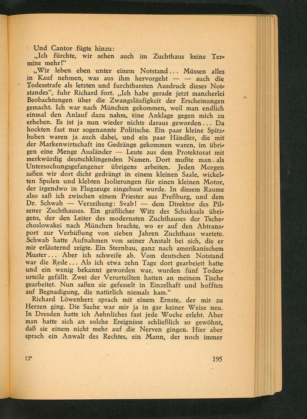 auch die Todesstrafe als letzten und furchtbarsten Ausdruck dieses Not standes", fuhr Richard fort. ,, Ich habe gerade jetzt mancherlei Beobachtungen über die Zwangsläufigkeit der Erscheinungen gemacht. Ich war nach München gekommen, weil man endlich einmal den Anlauf dazu nahm, eine Anklage gegen mich zu erheben. Es ist ja nun wieder nichts daraus geworden... Da hockten fast nur sogenannte Politische. Ein paar kleine Spitzbuben waren ja auch dabei, und ein paar Händler, die mit der Markenwirtschaft ins Gedränge gekommen waren, im übrigen eine Menge Ausländer Leute aus dem Protektorat mit merkwürdig deutschklingenden Namen. Dort mußte man. als Untersuchungsgefangener übrigens arbeiten. Jeden Morgen saßen wir dort dicht gedrängt in einem kleinen Saale, wickel ten Spulen und klebten Isolierungen für einen kleinen Motor, der irgendwo in Flugzeuge eingebaut wurde. In diesem Raume also saß ich zwischen einem Priester aus Preßburg , und dem Dr. Schwab Verzeihung: Svab! dem Direktor des Pilsener Zuchthauses. Ein gräßlicher Witz des Schicksals übri gens, der den Leiter des modernsten Zuchthauses der T'schechoslowakei nach München brachte, wo er auf den Abtransport zur Verbüßung von sieben Jahren Zuchthaus wartete. Schwab hatte Aufnahmen von seiner Anstalt bei sich, die er mir erläuternd zeigte. Ein Sternbau, ganz nach amerikanischem Muster... Aber ich schweife ab. Vom deutschen Notstand war die Rede... Als ich etwa zehn Tage dort gearbeiett hatte und ein wenig bekannt geworden war, wurden fünf Todesurteile gefällt. Zwei der Verurteilten hatten an meinem Tische gearbeitet. Nun saßen sie gefesselt in Einzelhaft und hofften auf Begnadigung, die natürlich niemals kam."