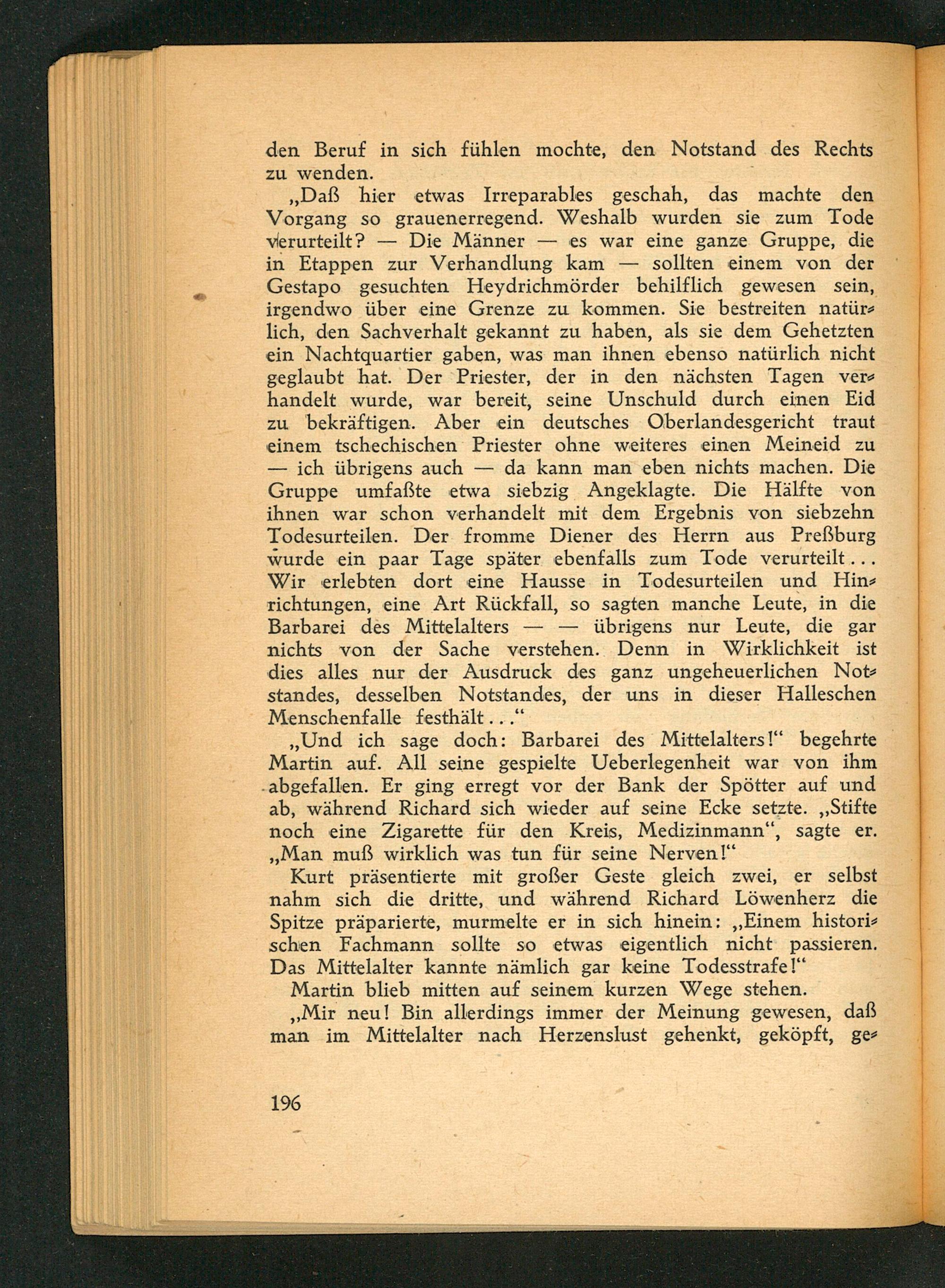 „Daß hier etwas Irreparables geschah, das machte den Vorgang so grauenerregend. Weshalb wurden sie zum Tode verurteilt?— Die Männer— es war eine ganze Gruppe, die in Etappen zur Verhandlung kam— sollten einem von der Gestapo gesuchten Heydrichmörder behilflich gewesen sein, irgendwo über eine Grenze zu kommen. Sie bestreiten natür- lich, den Sachverhalt gekannt zu haben, als sie dem Gehetzten ein Nachtquartier gaben, was man ihnen ebenso natürlich nicht geglaubt hat. Der Priester, der in den nächsten Tagen ver- handelt wurde, war bereit, seine Unschuld durch einen Eid zu bekräftigen. Aber ein deutsches Oberlandesgericht traut einem tschechischen Priester ohne weiteres einen Meineid zu — ich übrigens auch— da kann man eben nichts machen. Die Gruppe umfaßte etwa siebzig Angeklagte. Die Hälfte von ihnen war schon verhandelt mit dem Ergebnis von siebzehn Todesurteilen. Der fromme Diener des Herrn aus Preßburg wurde ein paar Tage später ebenfalls zum Tode verurteilt... Wir erlebten dort eine Hausse in Todesurteilen und Hin- richtungen, eine Art Rückfall, so sagten manche Leute, in die Barbarei des Mittelalters—— übrigens nur Leute, die gar nichts von der Sache verstehen. Denn in Wirklichkeit ist dies alles nur der Ausdruck des ganz ungeheuerlichen Not» standes, desselben Notstandes, der uns in dieser Halleschen Menschenfalle festhält...“