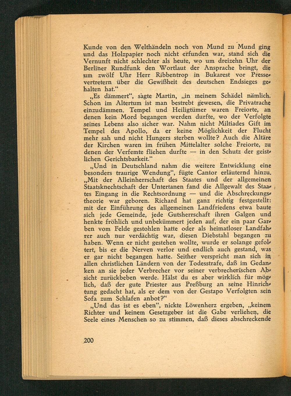 Kunde von den Welthändeln noch von Mund zu Mund ging und das Holzpapier noch nicht erfunden war, stand sich die Vernunft nicht schlechter als heute, wo um dreizehn Uhr der Berliner Rundfunk den Wortlaut der Ansprache bringt, die um zwölf Uhr Herr Ribbentrop in Bukarest vor Pressevertretern über die Gewißheit des deutschen Endsieges gehalten hat."