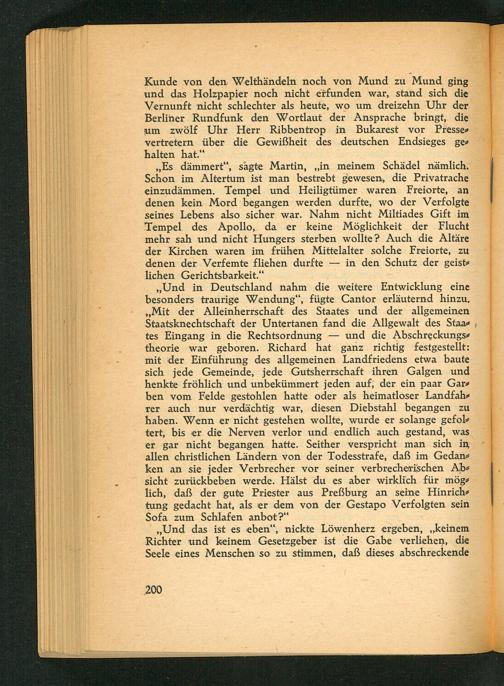 , Und in Deutschland nahm die weitere Entwicklung eine besonders traurige Wendung", fügte Cantor erläuternd hinzu. , Mit der Alleinherrschaft des Staates und der allgemeinen Staatsknechtschaft der Untertanen fand die Allgewalt des Staa tes Eingang in die Rechtsordnung und die Abschreckungstheorie war geboren. Richard hat ganz richtig festgestellt: mit der Einführung des allgemeinen Landfriedens etwa baute sich jede Gemeinde, jede Gutsherrschaft ihren Galgen und henkte fröhlich und unbekümmert jeden auf, der ein paar Gara ben vom Felde gestohlen hatte oder als heimatloser Landfahrer auch nur verdächtig war, diesen Diebstahl begangen zu haben. Wenn er nicht gestehen wollte, wurde er solange gefoltert, bis er die Nerven verlor und endlich auch gestand, was er gar nicht begangen hatte. Seither verspricht man sich in allen christlichen Ländern von der Todesstrafe, daß im Gedanken an sie jeder Verbrecher vor seiner verbrecherischen Absicht zurückbeben werde. Hälst du es aber wirklich für mög lich, daß der gute Priester aus Preßburg an seine Hinrichtung gedacht hat, als er dem von der Gestapo Verfolgten sein Sofa zum Schlafen anbot?"