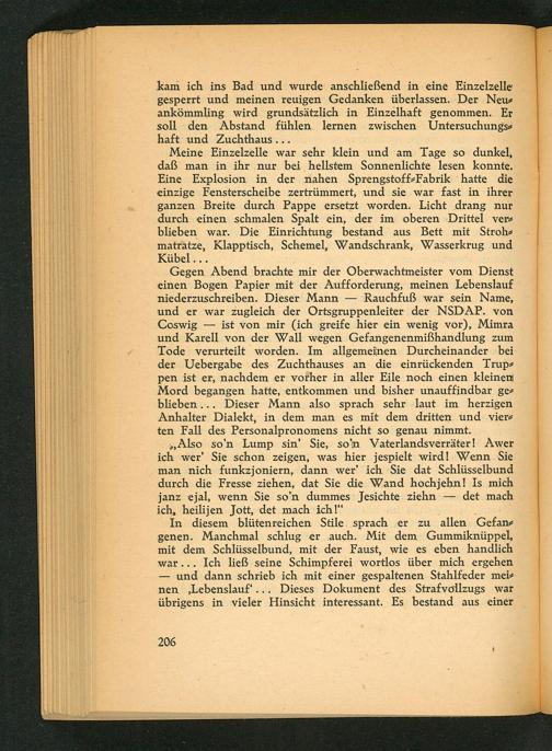 Gegen Abend brachte mir der Oberwachtmeister vom Dienst einen Bogen Papier mit der Aufforderung, meinen Lebenslauf niederzuschreiben. Dieser Mann Rauchfuß war sein Name, und er war zugleich der Ortsgruppenleiter der NSDAP . von Coswig ist von mir( ich greife hier ein wenig vor), Mimra und Karell von der Wall wegen Gefangenenmißhandlung zum Tode verurteilt worden. Im allgemeinen Durcheinander bei der Uebergabe des Zuchthauses an die einrückenden Truppen ist er, nachdem er vorher in aller Eile noch einen kleinen Mord begangen hatte, entkommen und bisher unauffindbar geblieben... Dieser Mann also sprach sehr laut im herzigen Anhalter Dialekt, in dem man es mit dem dritten und vierten Fall des Personalpronomens nicht so genau nimmt.
