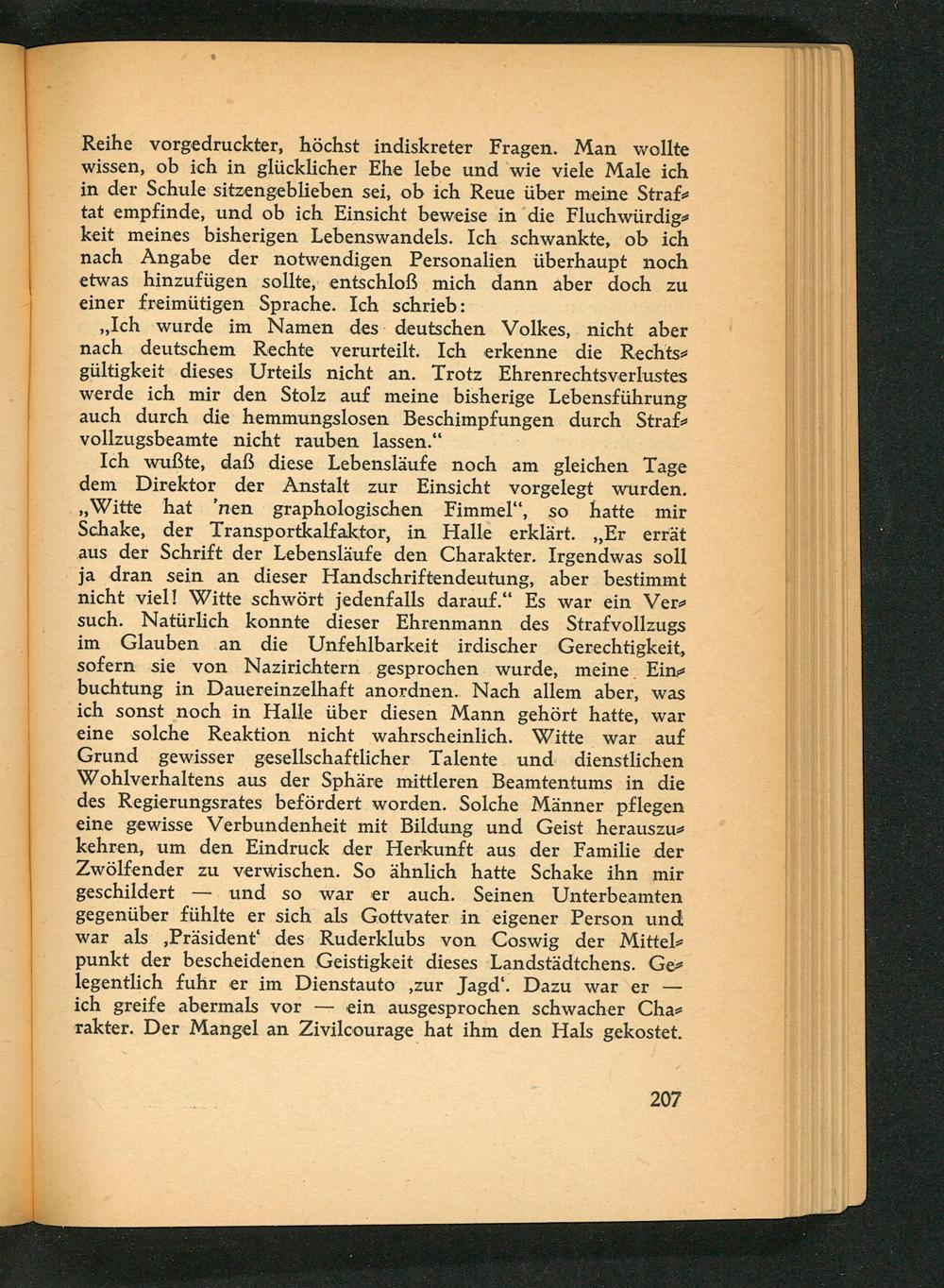 Ich wußte, daß diese Lebensläufe noch am gleichen Tage dem Direktor der Anstalt zur Einsicht vorgelegt wurden. , Witte hat' nen graphologischen Fimmel", so hatte mir Schake, der Transportkalfaktor, in Halle erklärt. ,, Er errät aus der Schrift der Lebensläufe den Charakter. Irgendwas soll ja dran sein an dieser Handschriftendeutung, aber bestimmt nicht viel! Witte schwört jedenfalls darauf." Es war ein Versuch. Natürlich konnte dieser Ehrenmann des Strafvollzugs im Glauben an die Unfehlbarkeit irdischer Gerechtigkeit, sofern sie von Nazirichtern gesprochen wurde, meine Einbuchtung in Dauereinzelhaft anordnen. Nach allem aber, was ich sonst noch in Halle über diesen Mann gehört hatte, war eine solche Reaktion nicht wahrscheinlich. Witte war auf Grund gewisser gesellschaftlicher Talente und dienstlichen Wohlverhaltens aus der Sphäre mittleren Beamtentums in die des Regierungsrates befördert worden. Solche Männer pflegen eine gewisse Verbundenheit mit Bildung und Geist herauszukehren, um den Eindruck der Herkunft aus der Familie der Zwölfender zu verwischen. So ähnlich hatte Schake ihn mir geschildert und so war er auch. Seinen Unterbeamten gegenüber fühlte er sich als Gottvater in eigener Person und war als, Präsident' des Ruderklubs von Coswig der Mittelpunkt der bescheidenen Geistigkeit dieses Landstädtchens. Ge legentlich fuhr er im Dienstauto, zur Jagd'. Dazu war er ich greife abermals vor ein ausgesprochen schwacher Charakter. Der Mangel an Zivilcourage hat ihm den Hals gekostet.
