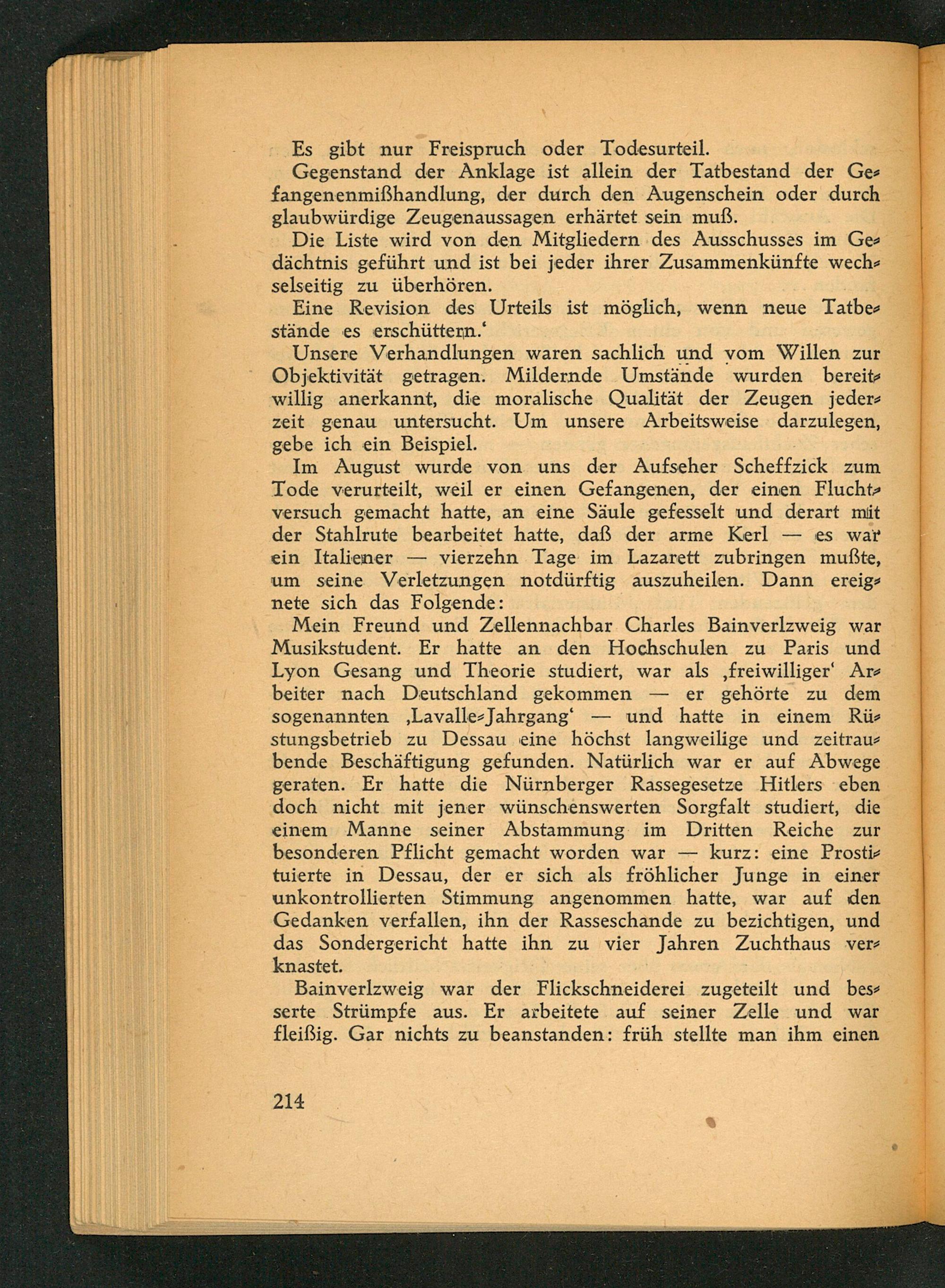 Mein Freund und Zellennachbar Charles Bainverlzweig war Musikstudent. Er hatte an den Hochschulen zu Paris und Lyon Gesang und Theorie studiert, war als, freiwilliger Arbeiter nach Deutschland gekommen er gehörte zu dem sogenannten, Lavalle- Jahrgang' und hatte in einem Rü stungsbetrieb zu Dessau eine höchst langweilige und zeitraubende Beschäftigung gefunden. Natürlich war er auf Abwege geraten. Er hatte die Nürnberger Rassegesetze Hitlers eben doch nicht mit jener wünschenswerten Sorgfalt studiert, die einem Manne seiner Abstammung im Dritten Reiche zur besonderen Pflicht gemacht worden war kurz: eine Prosti tuierte in Dessau , der er sich als fröhlicher Junge in einer unkontrollierten Stimmung angenommen hatte, war auf den Gedanken verfallen, ihn der Rasseschande zu bezichtigen, und das Sondergericht hatte ihn zu vier Jahren Zuchthaus verknastet.