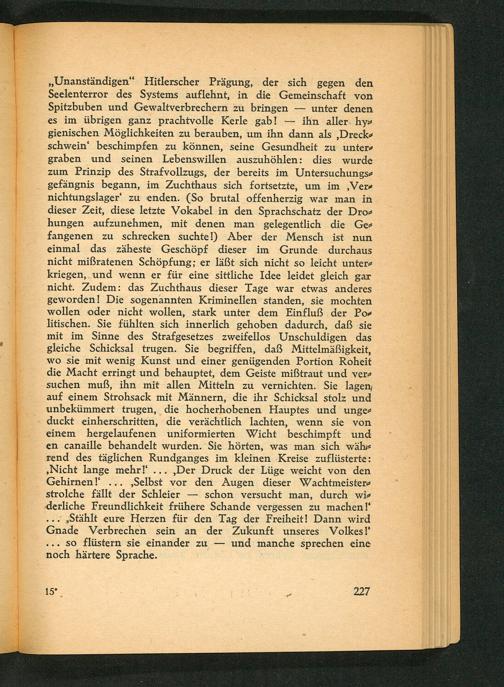 es im übrigen ganz prachtvolle Kerle gab! ihn aller hy gienischen Möglichkeiten zu berauben, um ihn dann als, Dreckschwein beschimpfen zu können, seine Gesundheit zu untergraben und seinen Lebenswillen auszuhöhlen: dies wurde zum Prinzip des Strafvollzugs, der bereits im Untersuchungsgefängnis begann, im Zuchthaus sich fortsetzte, um im, Ver nichtungslager zu enden.( So brutal offenherzig war man in dieser Zeit, diese letzte Vokabel in den Sprachschatz der Drohungen aufzunehmen, mit denen man gelegentlich die Gefangenen zu schrecken suchte!) Aber der Mensch ist nun einmal das zäheste Geschöpf dieser im Grunde durchaus nicht miẞratenen Schöpfung; er läßt sich nicht so leicht unterkriegen, und wenn er für eine sittliche Idee leidet gleich gar nicht. Zudem: das Zuchthaus dieser Tage war etwas anderes geworden! Die sogenannten Kriminellen standen, sie mochten wollen oder nicht wollen, stark unter dem Einfluß der Po litischen. Sie fühlten sich innerlich gehoben dadurch, daß sie mit im Sinne des Strafgesetzes zweifellos Unschuldigen das gleiche Schicksal trugen. Sie begriffen, daß Mittelmäßigkeit, wo sie mit wenig Kunst und einer genügenden Portion Roheit die Macht erringt und behauptet, dem Geiste mißtraut und ver suchen muß, ihn mit allen Mitteln zu vernichten. Sie lagen auf einem Strohsack mit Männern, die ihr Schicksal stolz und unbekümmert trugen, die hocherhobenen Hauptes und ungeduckt einherschritten, die verächtlich lachten, wenn sie von einem hergelaufenen uniformierten Wicht beschimpft und en canaille behandelt wurden. Sie hörten, was man sich wäh rend des täglichen Rundganges im kleinen Kreise zuflüsterte: , Nicht lange mehr!'..., Der Druck der Lüge weicht von den Gehirnen!', Selbst vor den Augen dieser Wachtmeisterstrolche fällt der Schleier schon versucht man, durch wis derliche Freundlichkeit frühere Schande vergessen zu machen!" .., Stählt eure Herzen für den Tag der Freiheit! Dann wird Gnade Verbrechen sein an der Zukunft unseres Volkes!' so flüstern sie einander zu und manche sprechen eine noch härtere Sprache.