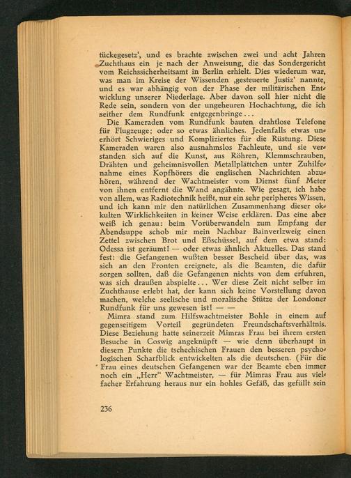 Mimra stand zum Hilfswachtmeister Bohle in einem auf gegenseitigem Vorteil gegründeten Freundschaftsverhältnis. Diese Beziehung hatte seinerzeit Mimras Frau bei ihrem ersten Besuche in Coswig angeknüpft wie denn überhaupt in diesem Punkte die tschechischen Frauen den besseren psychologischen Scharfblick entwickelten als die deutschen.( Für die Frau eines deutschen Gefangenen war der Beamte eben immer noch ein ,, Herr" Wachtmeister, für Mimras Frau aus vielfacher Erfahrung heraus nur ein hohles Gefäß, das gefüllt sein