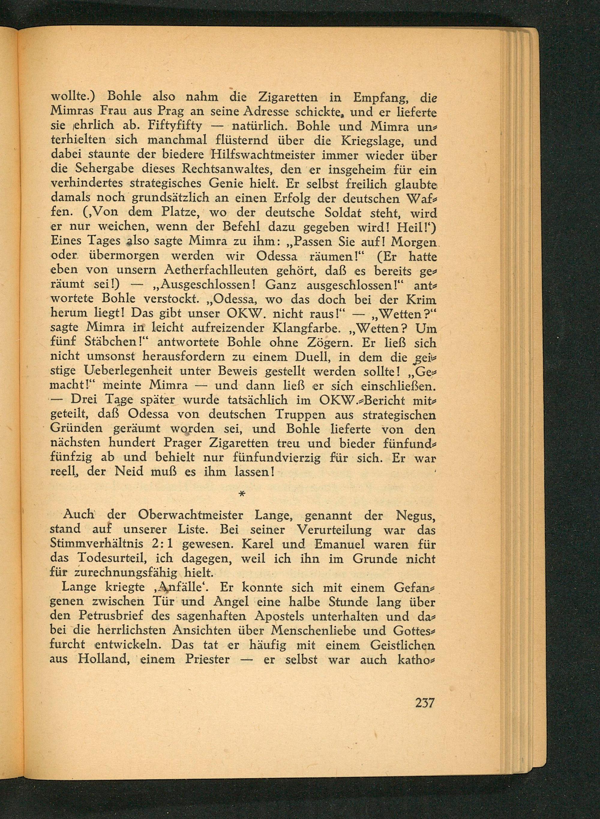 wollte.) Bohle also nahm die Zigaretten in Empfang, die Mimras Frau aus Prag an seine Adresse schickte, und er lieferte sie ehrlich ab. Fiftyfifty natürlich. Bohle und Mimra unterhielten sich manchmal flüsternd über die Kriegslage, und dabei staunte der biedere Hilfswachtmeister immer wieder über die Sehergabe dieses Rechtsanwaltes, den er insgeheim für ein verhindertes strategisches Genie hielt. Er selbst freilich glaubte damals noch grundsätzlich an einen Erfolg der deutschen Waffen.(, Von dem Platze, wo der deutsche Soldat steht, wird er nur weichen, wenn der Befehl dazu gegeben wird! Heil!') Eines Tages also sagte Mimra zu ihm: ,, Passen Sie auf! Morgen. oder übermorgen werden wir Odessa räumen!"( Er hatte eben von unsern Aetherfachlleuten gehört, daß es bereits geräumt sei!) ,, Ausgeschlossen! Ganz ausgeschlossen!" ant wortete Bohle verstockt. ,, Odessa, wo das doch bei der Krim herum liegt! Das gibt unser OKW . nicht raus!"- ,, Wetten?" sagte Mimra in leicht aufreizender Klangfarbe. ,, Wetten? Um fünf Stäbchen!" antwortete Bohle ohne Zögern. Er ließ sich nicht umsonst herausfordern zu einem Duell, in dem die gei stige Ueberlegenheit unter Beweis gestellt werden sollte! ,, Ge macht!" meinte Mimra und dann ließ er sich einschließen. Drei Tage später wurde tatsächlich im OKW.- Bericht mitgeteilt, daß Odessa von deutschen Truppen aus strategischen Gründen geräumt worden sei, und Bohle lieferte von den nächsten hundert Prager Zigaretten treu und bieder fünfundfünfzig ab und behielt nur fünfundvierzig für sich. Er war reell, der Neid muß es ihm lassen!
