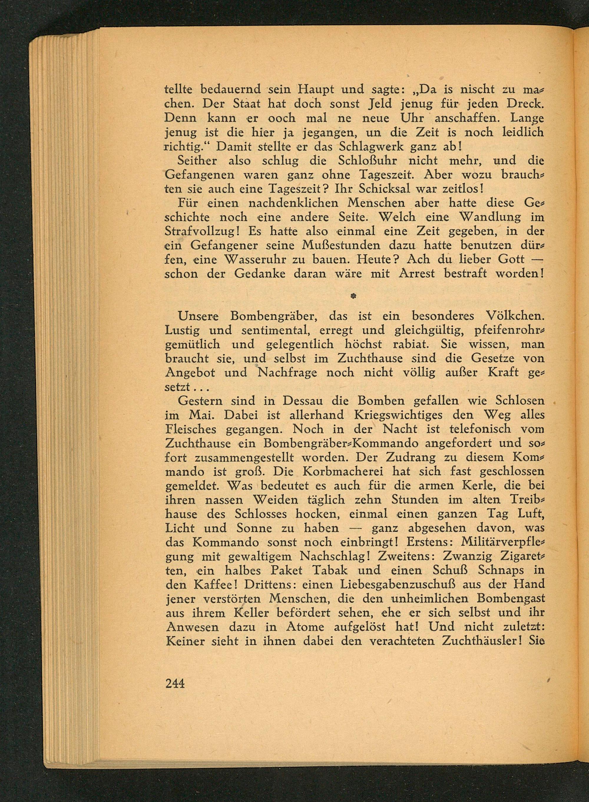 Gestern sind in Dessau die Bomben gefallen wie Schlosen im Mai. Dabei ist allerhand Kriegswichtiges den Weg alles Fleisches gegangen. Noch in der Nacht ist telefonisch vom Zuchthause ein Bombengräber- Kommando angefordert und so= fort zusammengestellt worden. Der Zudrang zu diesem Kommando ist groß. Die Korbmacherei hat sich fast geschlossen gemeldet. Was bedeutet es auch für die armen Kerle, die bei ihren nassen Weiden täglich zehn Stunden im alten Treibhause des Schlosses hocken, einmal einen ganzen Tag Luft, Licht und Sonne zu haben ganz abgesehen davon, was das Kommando sonst noch einbringt! Erstens: Militärverpflegung mit gewaltigem Nachschlag! Zweitens: Zwanzig Zigaret ten, ein halbes Paket Tabak und einen Schuß Schnaps in den Kaffee! Drittens: einen Liebesgabenzuschuß aus der Hand jener verstörten Menschen, die den unheimlichen Bombengast aus ihrem Keller befördert sehen, ehe er sich selbst und ihr Anwesen dazu in Atome aufgelöst hat! Und nicht zuletzt: Keiner sieht in ihnen dabei den verachteten Zuchthäusler! Sie