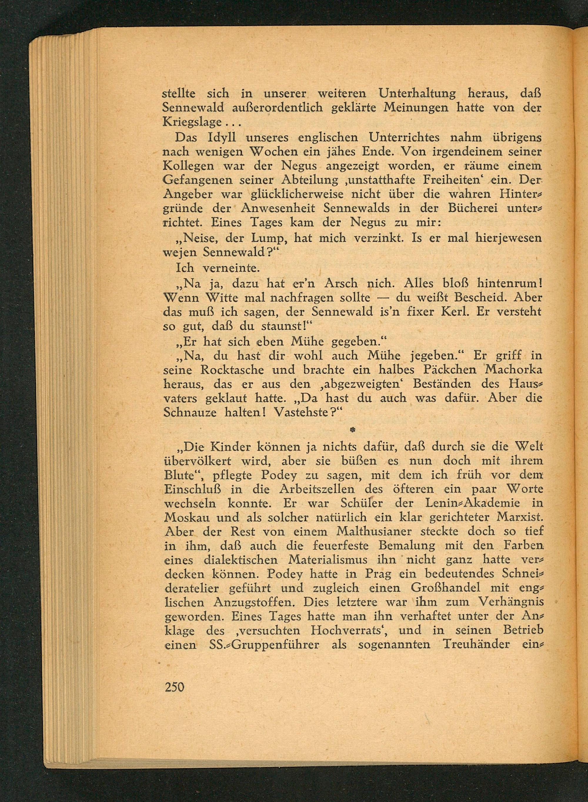 ,, Die Kinder können ja nichts dafür, daß durch sie die Welt übervölkert wird, aber sie büßen es nun doch mit ihrem Blute", pflegte Podey zu sagen, mit dem ich früh vor dem Einschluß in die Arbeitszellen des öfteren ein paar Worte wechseln konnte. Er war Schüler der Lenin- Akademie in Moskau und als solcher natürlich ein klar gerichteter Marxist. Aber der Rest von einem Malthusianer steckte doch so tief in ihm, daß auch die feuerfeste Bemalung mit den Farben eines dialektischen Materialismus ihn nicht ganz hatte verdecken können. Podey hatte in Prag ein bedeutendes Schnei deratelier geführt und zugleich einen Großhandel mit englischen Anzugstoffen. Dies letztere war ihm zum Verhängnis geworden. Eines Tages hatte man ihn verhaftet unter der Anklage des versuchten Hochverrats', und in seinen Betrieb einen SS.- Gruppenführer als sogenannten Treuhänder ein