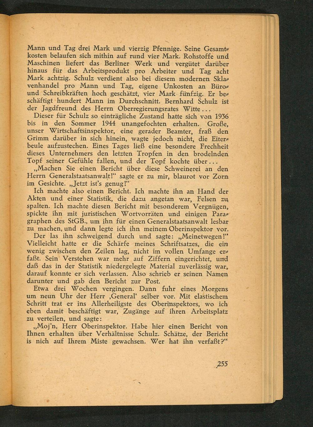 Dieser für Schulz so einträgliche Zustand hatte sich von 1936 bis in den Sommer 1944 wunangefochten erhalten. Große, unser Wirtschaftsinspektor, eine gerader Beamter, fraß den Grimm darüber in sich hinein, wagte jedoch nicht, die Eiter- beule aufzustechen. Eines Tages ließ eine besondere Frechheit dieses Unternehmers den letzten Tropfen in den brodelnden Topf seiner Gefühle fallen, und der Topf kochte über...