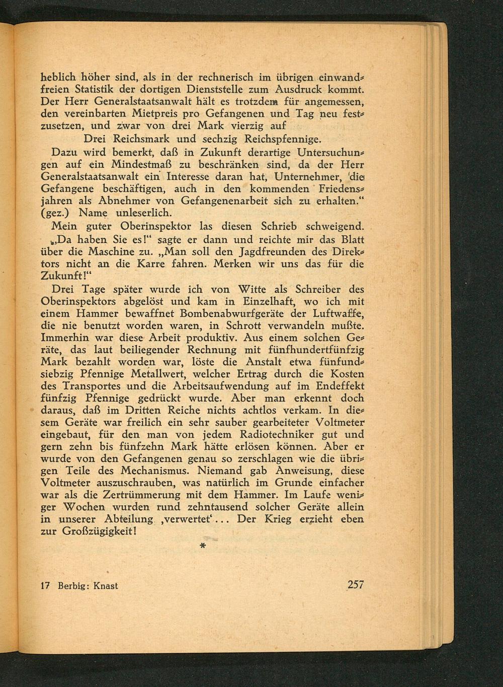 Drei Tage später wurde ich von Witte als Schreiber des Oberinspektors abgelöst und kam in Einzelhaft, wo ich mit einem Hammer bewaffnet Bombenabwurfgeräte der Luftwaffe, die nie benutzt worden waren, in Schrott verwandeln mußte. Immerhin war diese Arbeit produktiv. Aus einem solchen Geräte, das laut beiliegender Rechnung mit fünfhundertfünfzig Mark bezahlt worden war, löste die Anstalt etwa fünfundsiebzig Pfennige Metallwert, welcher Ertrag durch die Kosten des Transportes und die Arbeitsaufwendung auf im Endeffekt fünfzig Pfennige gedrückt wurde. Aber man erkennt doch daraus, daß im Dritten Reiche nichts achtlos verkam. In diesem Geräte war freilich ein sehr sauber gearbeiteter Voltmeter eingebaut, für den man von jedem Radiotechniker gut und gern zehn bis fünfzehn Mark hätte erlösen können. Aber er wurde von den Gefangenen genau so zerschlagen wie die übri gen Teile des Mechanismus. Niemand gab Anweisung, diese Voltmeter auszuschrauben, was natürlich im Grunde einfacher war als die Zertrümmerung mit dem Hammer. Im Laufe weni ger Wochen wurden rund zehntausend solcher Geräte allein in unserer Abteilung verwertet... Der Krieg erzieht eben zur Großzügigkeit!