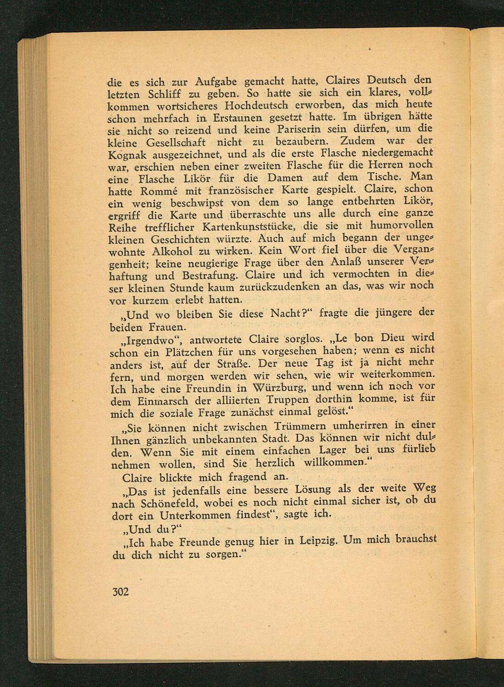 ,, Irgendwo", antwortete Claire sorglos. ,, Le bon Dieu wird schon ein Plätzchen für uns vorgesehen haben; wenn es nicht anders ist, auf der Straße. Der neue Tag ist ja nicht mehr fern, und morgen werden wir sehen, wie wir weiterkommen. Ich habe eine Freundin in Würzburg , und wenn ich noch vor dem Einmarsch der alliierten Truppen dorthin komme, ist für mich die soziale Frage zunächst einmal gelöst."
